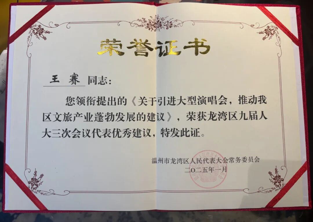 王赛律师表示:过去一年,我始终牢记使命,坚守代表之责,秉持服务之心,认真履职。有幸因《关于引进大型演唱会,推动我区文旅产业蓬勃发展的建议》荣获优秀建议,这离不开各部门领导的高度重视,以及承办单位的积极协作。如今,新岁已至,我又提出《关于多渠道发展学前教育,方便度山村、刘宅村、郑宅村三村辖区适龄儿童就近就学的建议》,希望能再度得到各方支持。新的一年,让我们继续携手奋进,为龙湾建设添砖加瓦,让更多民生福祉惠及群众 。